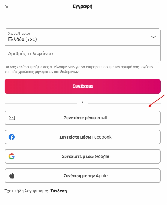 2. Επιλέγετε το λινκ "συνεχίστε μέσω email"