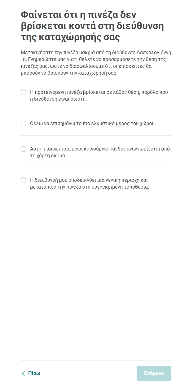 3. Τοποθετείτε την διεύθυνση της οικίας. Αν η διεύθυνση που διαθέτετε δεν είναι ακριβής, τότε στο επόμενο βήμα μετακινείτε την πινέζα στον χάρτη ακριβώς στο σημείο που βρίσκεται η οικία σας.