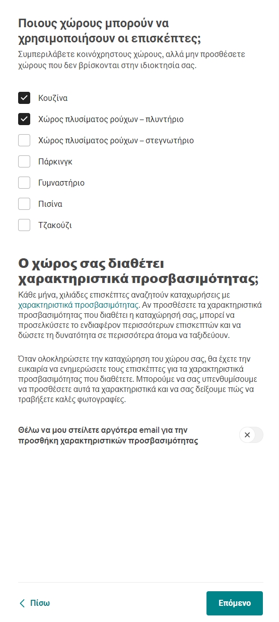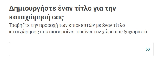 4. Συμπληρώνετε τις παροχές, εξοπλισμό, και ανεβάζετε 3-4 φωτογραφίες του χώρου σας (τις υπόλοιπες θα τις ανεβάσουμε εμείς). Το ίδιο κάνετε και για το κείμενο περιγραφής του χώρου σας. Μία παράγραφος στο στάδιο αυτό αρκεί. Τέλος δίνετε έναν τίτλο καταλύματος.