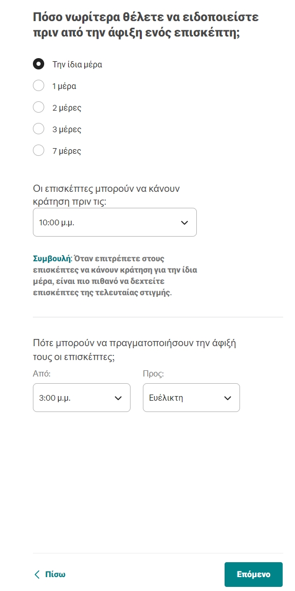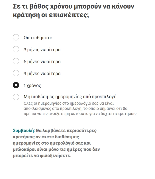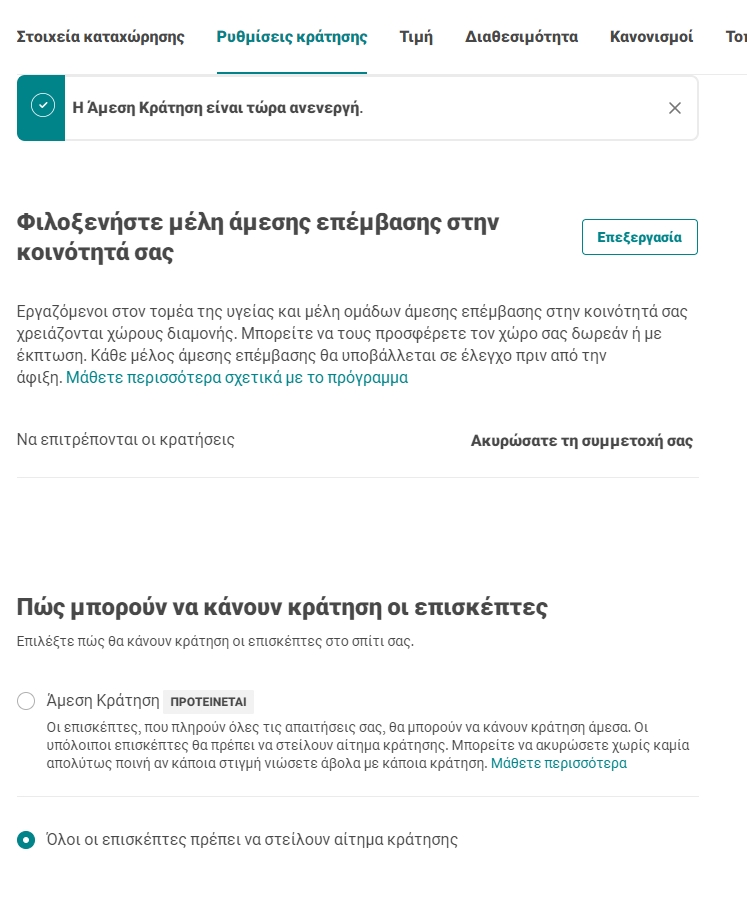 9. Θα σας μεταφέρει στο κεντρικό dashboard της καταχώρησης σας όπου μένουν τρία τελευταία βήματα για την ολοκλήρωση της διαδικασίας ώστε να μπορούμε αμέσως μετά να αναλάβουμε εμείς τα υπόλοιπα. Στην καρτέλα "ΡΥΘΜΙΣΕΙΣ ΚΡΑΤΗΣΗΣ" απεπιλέξτε την επιλογή της άμεσης κράτησης και επιλέξτε την "κατόπιν αιτήματος". Επιλέγεται για λόγους ασφαλείας έως ότου έχουμε μπει στην καταχώρηση σας και έχουμε ολοκληρώσει την παραμετροποίησή της σε όλα της τα σημεία.
