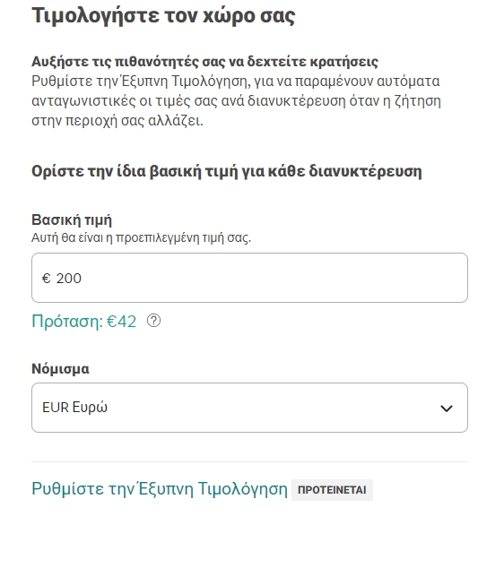 7. Ρύθμιση base τιμής. Από το παράθυρο ρύθμισης τιμών επιλέξτε στο κάτω σημείο το λινκ για την βασική τιμή (δεν θέλετε την έξυπνη τιμολόγηση της airbnb) και τοποθετήστε το μέγιστο ποσό που χρεώνετε σε ένα έτος για την οικία σας. (συνήθως την τιμή / βραδιά Αυγούστου).