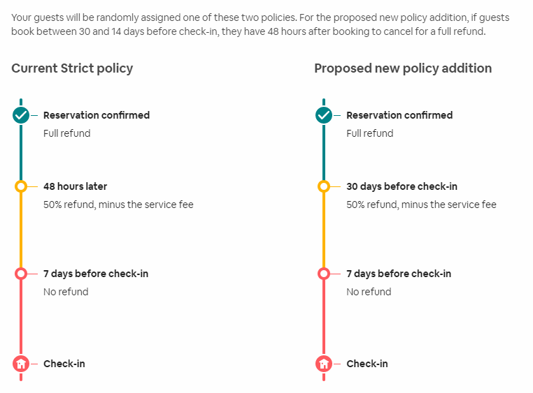 Στην Airbnb εφαρμόζουμε μια αυστηρή πολιτική ακύρωσης (strict) ή αυστηρή με έξτρα επιλογή μη επιστρεπτέα (strict/non-refundable) . Στην αυστηρή πολιτική ακύρωσης παρέχεται δυνατότητα δωρεάν ακύρωσης εντός 48 ωρών από την στιγμή της κράτησης, εφόσον μεσολαβούν από την επιβεβαίωση της κράτησης τουλάχιστον 14 ημέρες πριν από την άφιξη. Μετά την παρέλευση των 48 ωρών, εάν ο επισκέπτης ακυρώσει μέχρι και 7 ημέρες πριν την άφιξη, δικαιούται επιστροφή του 50% του ποσού. Ακυρώσεις που γίνονται λιγότερο από 7 ημέρες πριν την άφιξη οδηγούν στην απώλεια του συνόλου του ποσού. Αν η κράτηση ακολουθεί μια πολιτική ακύρωσης non-refundable, ο πελάτης λαμβάνει έκπτωση 10% στο συνολικό ποσό της κράτησης, αλλά σε περίπτωση ακύρωσης, το ποσό δεν επιστρέφεται. Υπάρχουν ειδικές περιπτώσεις όπου η Airbnb μπορεί να αποφασίσει την πλήρη επιστροφή χρημάτων, ανεξάρτητα από την πολιτική ακύρωσης, όπως σε περίπτωση θανάτου ή σοβαρής ασθένειας.